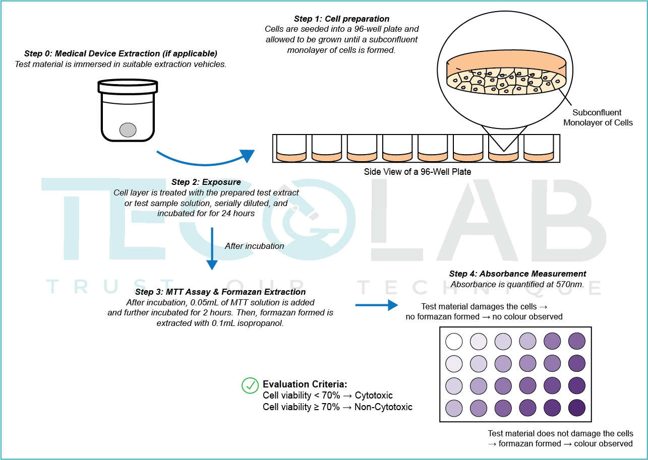 The diagram below provides a summary of the test method according to ISO 10993-5.