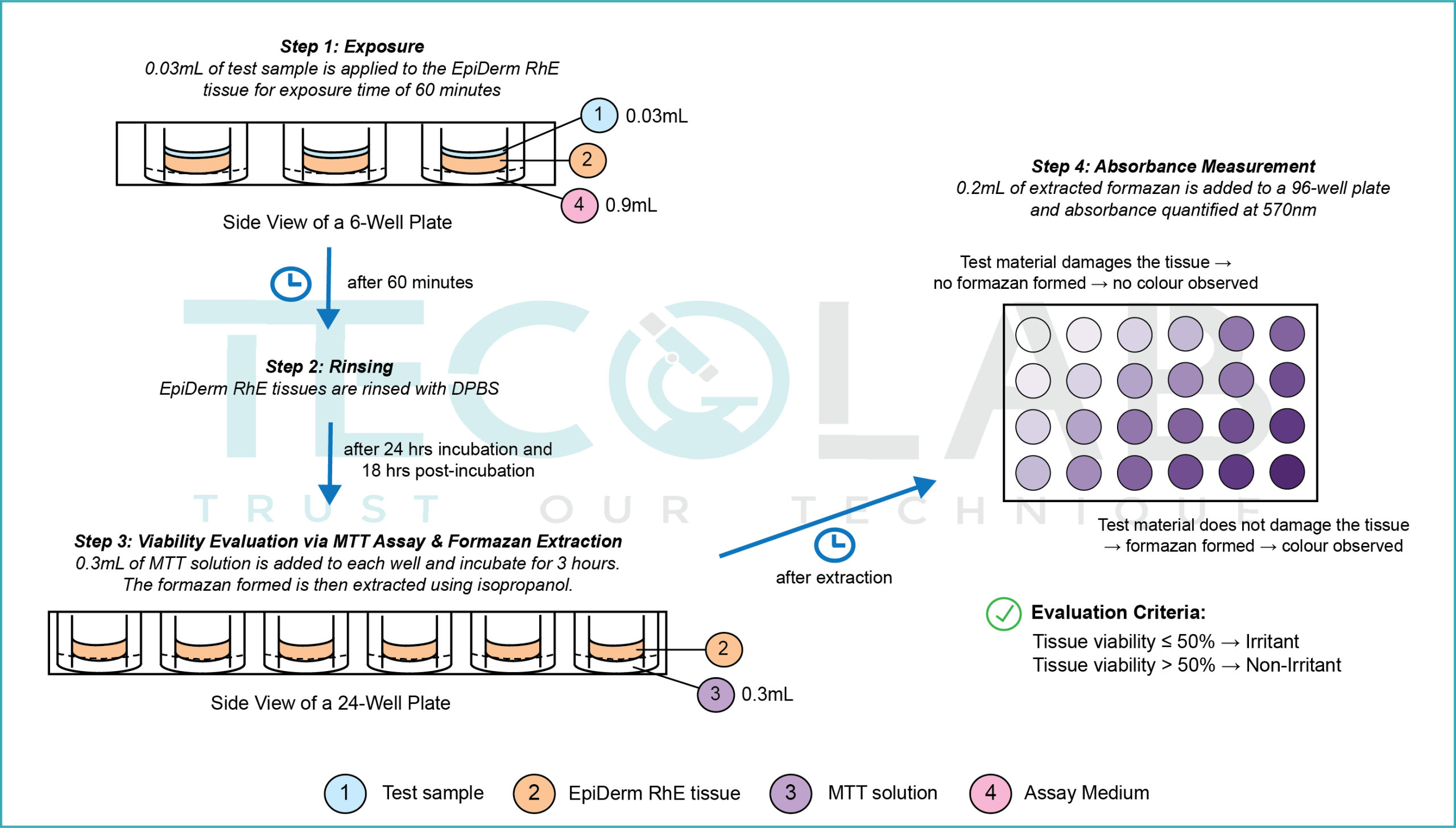 Skin irritation testing is performed using the EpiDerm model, which utilizes Reconstructed Human Epidermis (RhE). This method follows OECD 439, an internationally recognized guideline for assessing the skin irritation potential of biocides, chemicals, and cosmetics—without the need for animal testing.