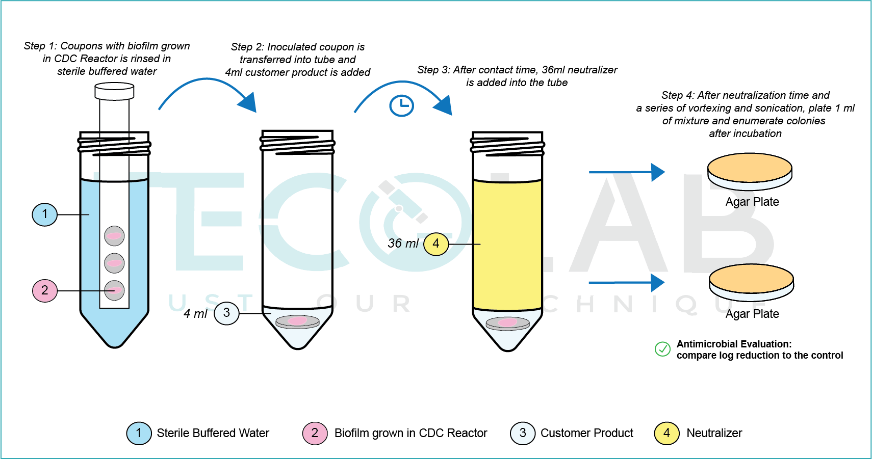 ASTM E2871 is a standard developed under the American Society for Testing and Materials (ASTM) used to evaluate the efficacy of disinfectants against bacterial biofilm. The infographic below shows a brief insight of ASTM E2871 procedure.