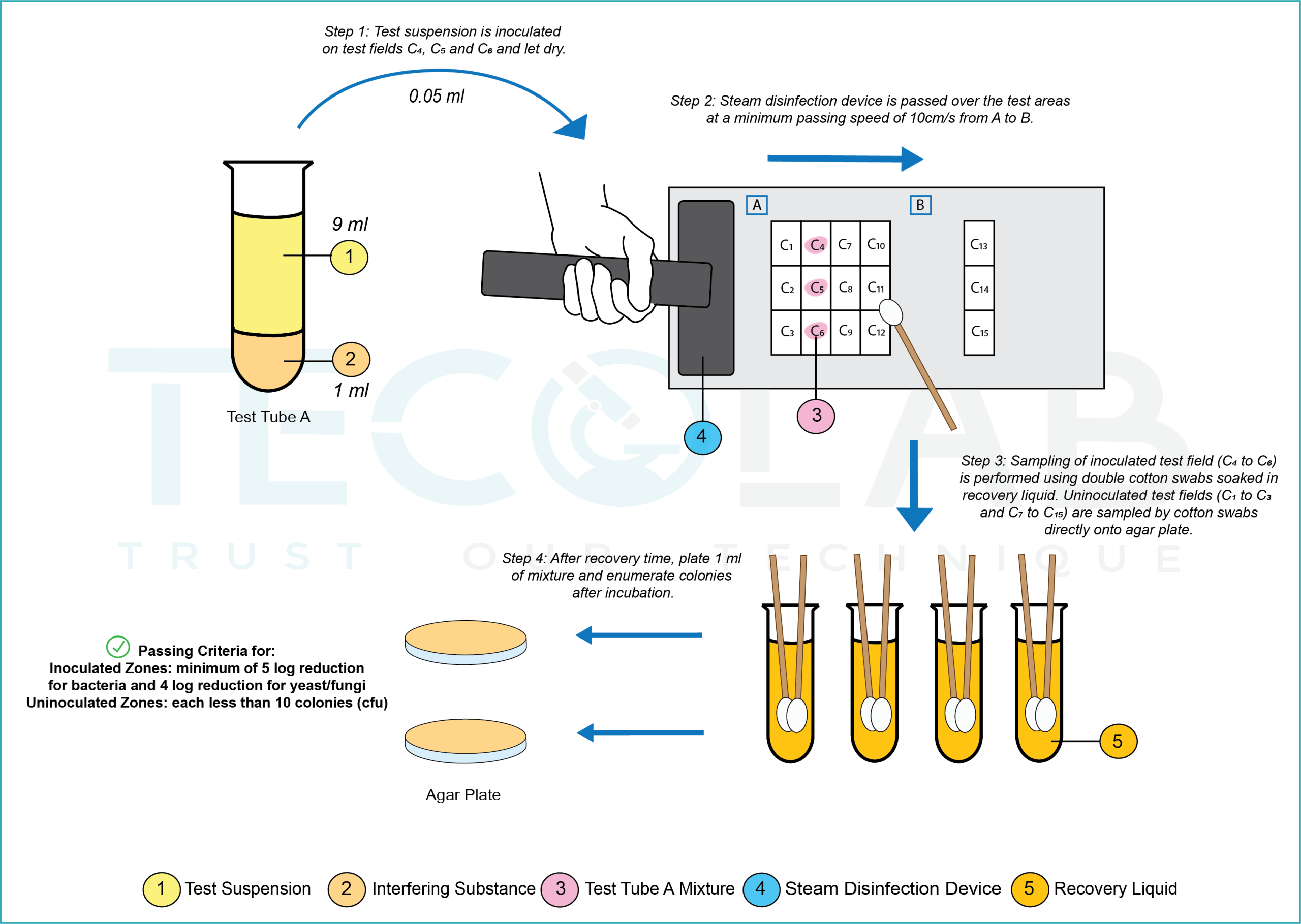 NF T72-110 is an AFNOR standard used to evaluate steam disinfection devices used on non-porous surfaces. This method is suitable to determine all antimicrobial activities including bactericidal, yeasticidal, fungicidal, sporicidal and virucidal activity in all areas. The infographic below shows a brief insight of our in-house test method for steam disinfection based on NF T72-110.